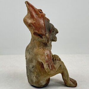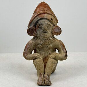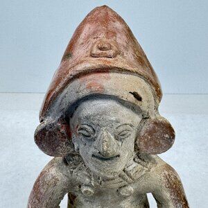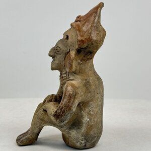 This Ecuadorian clay figurine showcases a seated figure wearing a detailed hat and earrings, emphasizing traditional craftsmanship. A unique collector's piece.