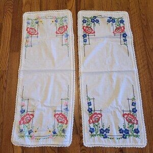 Vintage Handmade Embroidered Table Runners Floral Set of 2 Lace Edges