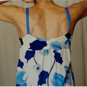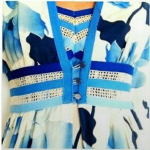 Vintage Handmade Estate Floral Peignoir Maxi Set. Stunning blue floral pattern, w/intricate woven ribbon design on top of gown & waist of robe. Robe closes w/ pearlized blue buttons. Robe has 3/4 length sleeves. Purchased from the estate of an heiress who had her clothing made for her. Both measure about 54" long. Dress- Straps- 7". Chest- 30". Excellent condition. Best for an X-small/small.
