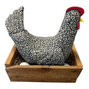 Bring a touch of cozy farmhouse charm to your home with this delightful handmade nesting hen decor. The stuffed fabric chicken features a black and white floral calico print with red felt comb and wattles, and is nestled in a rustic wooden box filled with straw and white eggs. A sweet addition to a country kitchen, Easter display, or rustic shelf.
