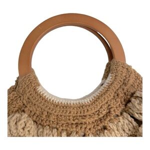 Vintage Handmade Floral Crochet Granny Style Bag, tan /cream wooden handles
