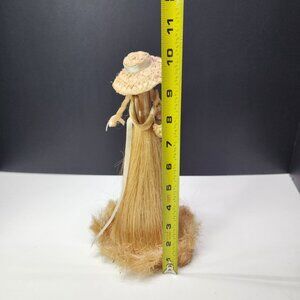 This Vintage Handmade Folk Art Straw Doll Lady is 10'' tall, radiating rustic charm. Adorned with a wide-brimmed hat, it's the perfect addition to any folk art collection.