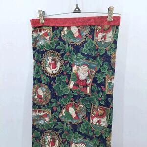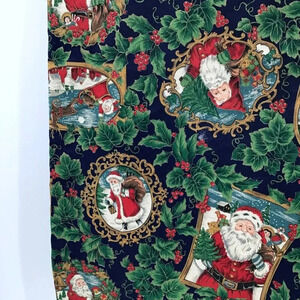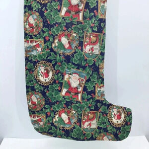 Huge handmade Christmas stocking measuring 31" long x 18" wide across the foot. Fits oodles of stocking stuffers. The pattern is on both sides, and features various vignettes of a vintage Nordic Santa Claus doing his thing, with holly and berries framing the images on a backdrop of dark blue. Cuffed in red marble-patterned trim.