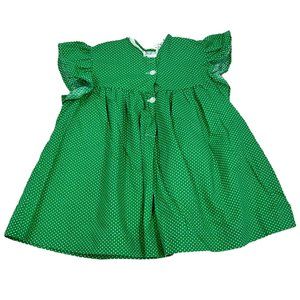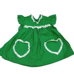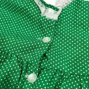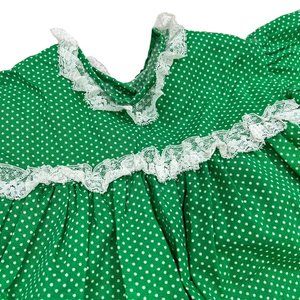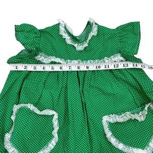 Vintage Handmade Girls Green Polka Dot Spring Dress Lace Trim Front Pockets