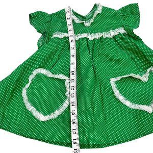 This handmade vintage-inspired girls green polka dot spring dress is perfect for any occasion. The lace trim and front pockets add a playful touch to this size 12 Months dress.
