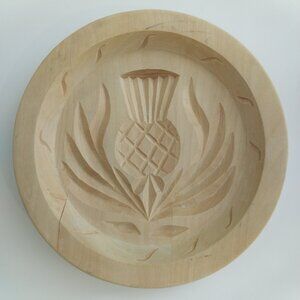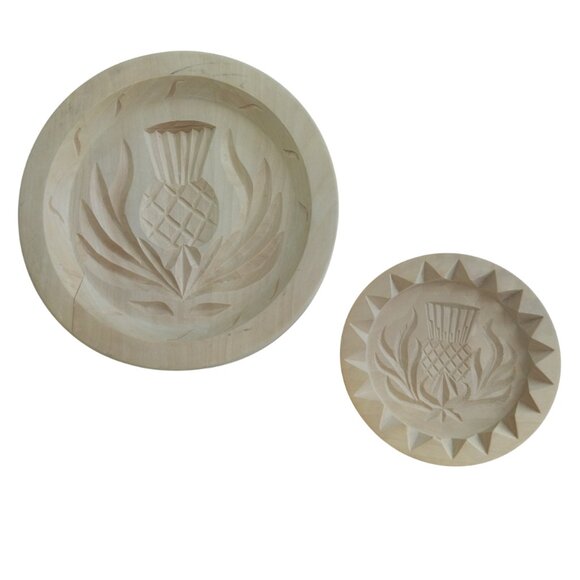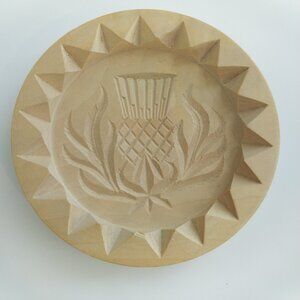 Hand carved wood round shortbread molds featuring a traditional Scottish thistle design, the national emblem of Scotland