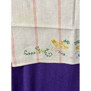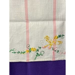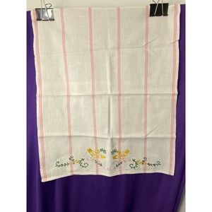 Vintage, Handmade Kitchen/Dish/Tea Towel with Hand Embroidered Flowers. White, waffle weave cotton towel with pink vertical stripe design. Beautiful floral pattern in pink, yellow, green, and white.