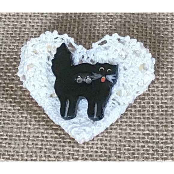 Vintage Handmade Lace Heart Black Cat Brooch Pin Kitty Whimsigoth Witch Core