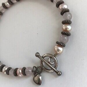 Vintage Handmade Mauve Pearls Rose Quartz Sterling Silver Charm Toggle Bracelet