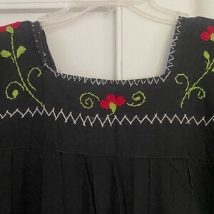 Vintage handmade cotton Mexican long sundress. I purchased this from a woman who had it in her closet for many years and said it was never worn. Pretty embroidered flowers on a deep, chocolate brown background. The dress has side slits and fits a small/medium.