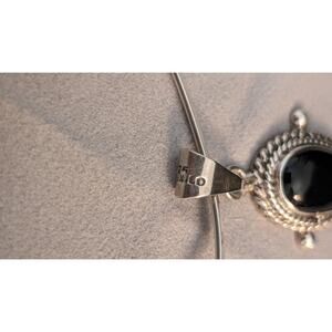 Vintage Handmade Mexico 925 Black Onyx Sterling Silver Hook & Catch Loop Torque Collar Necklace. From the best I can measure, this collar is 17" around the inside. The pendant measures 2" (including bale) by 1-1/8" wide. It's a large bale for even larger omegas, collars you may have. Collar is 2mm wide. Pre-owned, this vintage necklace is in excellent condition.