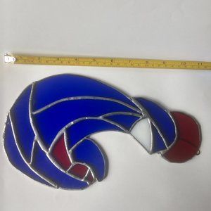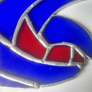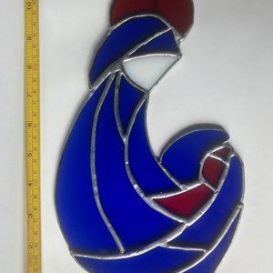 Deep blue, red and white stained glass. Handmade. Vintage. Depicts Virgin Mother Mary holding Baby Jesus. Ideal for Christmas.