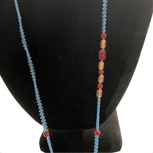 This beautiful vintage handmade necklace is in excellent condition. It is made with string glass seed beads. The blue beads are a translucent matte finish, and the white beads have some iridescence to them. The pouch is open on top the necklace is approximately 18” long and the pouch is about 4 1/2” of that including the fringe.