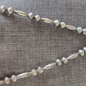 Absolutely amazing handmade Native American Navajo sterling Pearl and barrel bead necklace with Naja is in excellent vintage condition. Stunning sterling handmade round pearls and elongated barrel beads with attached 2" Naja pendant with amazing detail to hands. Hook closure. Barrel beads measure approximately 5/8" long, and it weighs approximately 40.7 grams. It measures approximately 19" long. A truly special and highly collectible piece of wearable art! From non-smoking home. 🩶❤️🎁