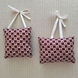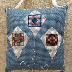 Vintage Handmade Small Needlework Pillow Door Hanger Ornament, set of 2. 1 blue square pillow with 3 quilt patterned kites. 1 pink rectangular pillow with a cut watermelon and a green floral trim. Each pillow has a white satin ribbon for hanging and is backed with a vintage heart checkerboard fabric. Hang in a girls room or door, a boys room or door, a nursery room or door, craft room or door or use as a pin cushion.