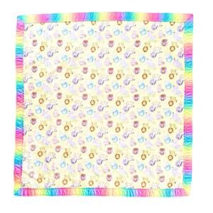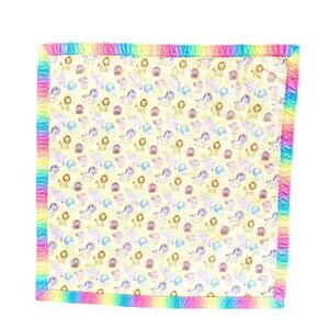 Vintage. Handmade. Yellow fleece precious moments animal character figures print baby blanket with rainbow tie dye satin border trim. Preowned in good condition with no stains or tears. No maker marks or content tag.