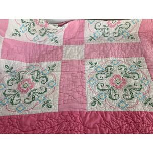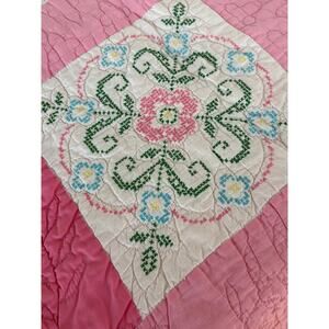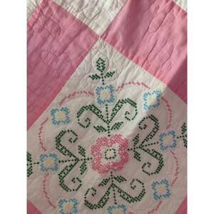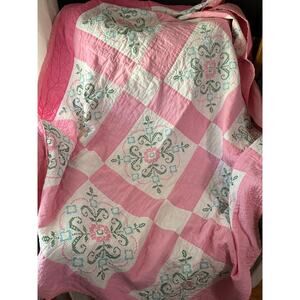 Vintage Handmade Quilt-Pink Shades w/Floral Embroidery 55" x 68" No Stains/Holes