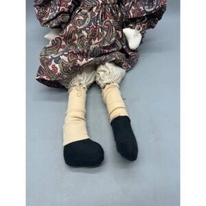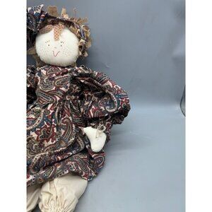 This vintage handmade rag doll features a charming paisley dress and bonnet, showcasing intricate craftsmanship suitable for collectors or decorative purposes.