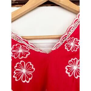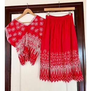 Vintage Handmade Red & White Floral Embroidered Crochet Cotton Matching Skirt Set — Size Small