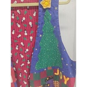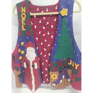 This vintage handmade reversible Christmas vest in size medium is a unique and stylish addition to any woman's wardrobe. Made from cotton with a quilted design, this blue vest features a festive Christmas theme that can be worn in two different ways. The reversible feature adds versatility to the piece, making it a practical choice for the holiday season or any time of year. Perfect for layering or wearing on its own, this vest is a charming and one-of-a-kind piece that is sure to stand out.