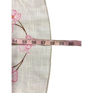 Add charm to your table with this lovely vintage round tablecloth featuring delicate pink embroidered flowers and brown stitching on a cream background. Beautiful for farmhouse, cottage, shabby chic, or spring décor.