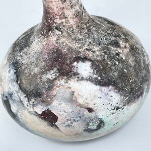 Stunning shape on this clay pot revealing a misty appearance with earth tones in black, beige and delicate pinks.