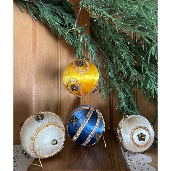 Vintage Handmade Satin String Covered Christmas Balls Ornaments Set of 4