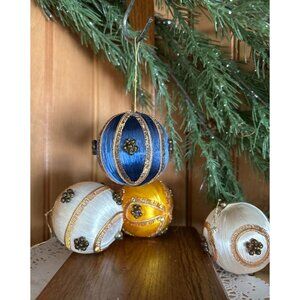 There are 2 white, 1 gold, and 1 blue. Each ornament ahs brown beads in a floral design on 4 sides of the ball and gold trim. They each have a different design.
