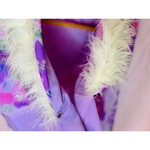This adorable purplie pink floral crop-top is ready to make its next lucky Lady feel adorably sexy. It closes in the front with a hook n eye and a tie. Please see photos aspart of the discretion on condition details. The applied feather do shed just be aware, this are still full and lovely.