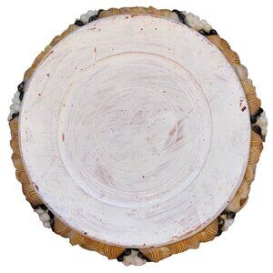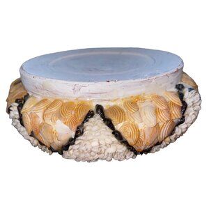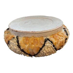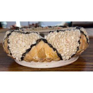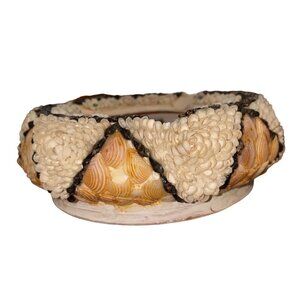 This intricately designed shell-encrusted bowl is a captivating piece for collectors of unique home decor. Each shell is thoughtfully arranged, adding textural depth and visual appeal. Its vintage charm and handmade quality make it a distinctive addition to any display. Ideal for showcasing on a mantel or as a centerpiece.