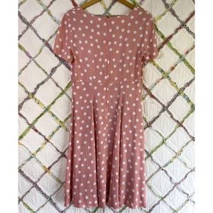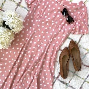 Short sleeve, open scoop neck, empire waistline, fit & flare midi dress silhouette featuring a mod white polka dot on soft baby pink ground. Soft woven cotton/rayon hand fabric.