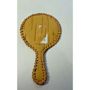 Vintage Handmade Small Decorated Russian Birch Wood Hand Mirror with Handle. 5.5" long x 3.25" diameter. Handmade and hand decorated in Russia.