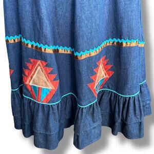 Vintage Handmade Southwest Denim Skirt Tiered Ruffle Hem Abstract Art Appliqué