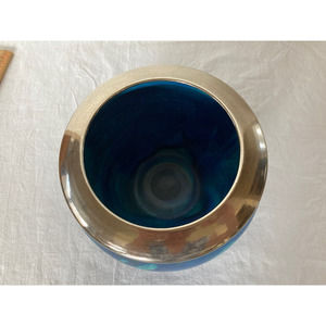 Vintage Handmade Studio Pottery Blue Round Circular Vase Signed Silver Band Rim