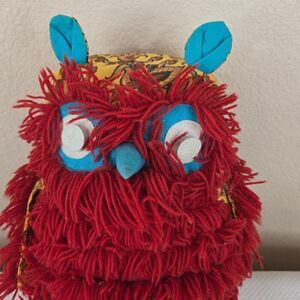 Vintage Handmade Thai Red Yarn Owl Plush With Decorative Yellow Feet