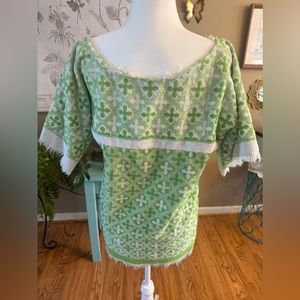This top is so cute. It’s vintage and handmade from a bath towel. It’s pretty thick and heavy. There is no size due to it being hand made. Measurements are 19.5 inches across and about 25 inches long.