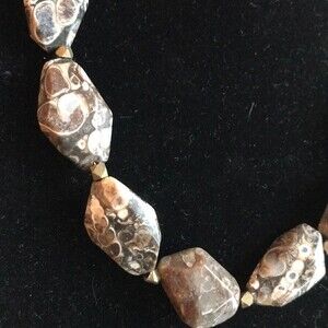 Vintage Handmade Turritella Agate Brass Beads Sterling Clasp Necklace 18"