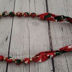 Pre-owned hand made UGLY Christmas party or Christmas necklace made of fabric & gold toned plastic beads. It is in good condition, no noted flaws. 13"