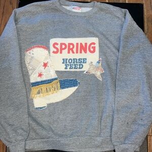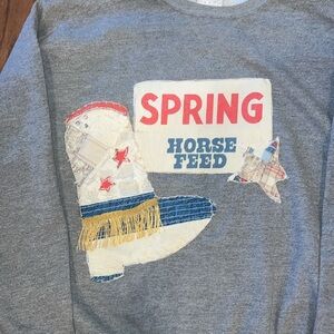 Handmade by me, upcycled vintage quilt pieces, western cowgirl boot design and vintage feed sack graphic, vintage he gray crewneck sweatshirt. Original and unique design and quilt pieces.