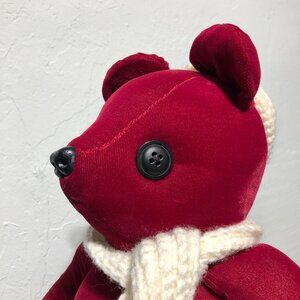 Vintage Handmade Velvet Red Teddy Bear Button Eyes Scarf & Hat. There is one leg that has the seams loosening. Please see pictures for more detail. Chair not included and used for prop only. We also have other vintage bears available.