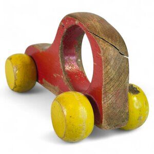 This is a vintage, handcrafted wooden push toy car—a sweet piece of playtime nostalgia. It features a red-painted body with bright yellow globe wheels and a convenient “handle” cutout for easy gripping. The car shows character with worn paint and a minor crack on top (see pics), but rolls perfectly and is full of charm.