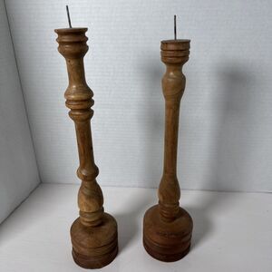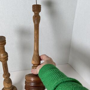 Two very lovely, very vintage, handmade wooden spindle style candle holders. They are a lovely neutral wood color, . The taller of the two stands about 12 1/2 inches. The smaller is about 12 inches. They are solid wood. I do not see a signature on the base, but they are lovely. Please see photos for details.