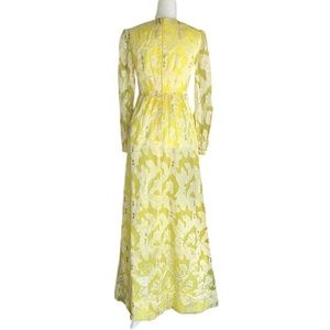 Vintage Handmade Yellow Metallic Gold Silver Floral Jacquard Maxi Dress Gown XS