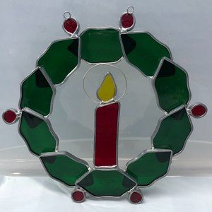 Vintage Handmade in the USA Stained Glass Wreath with Candle