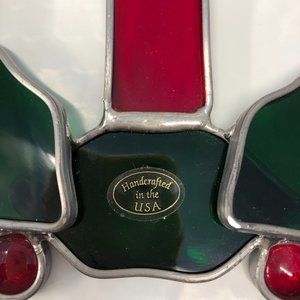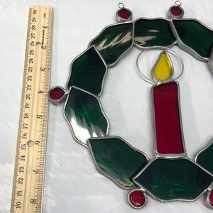 Vintage- approximately 8" diameter hanging STAINED GLASS LEADED CHRISTMAS WREATH. Excellent preowned condition.