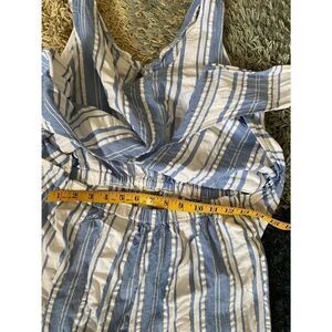 Amazing hand made vintage romper, denim blue / white stripe, ruched, bodice ties in front creating a bare midriff, elastic waist, wide leg, cropped hem, has no size tag, looks to me to be about a medium, but please See Measurements for Custom Fit.