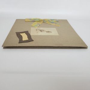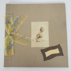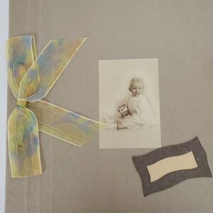 Front is Tan with a Multi-Color Yellow Pastel Bow Ribbon Binding, Center Vintage Toddler Picture & A Nameplate