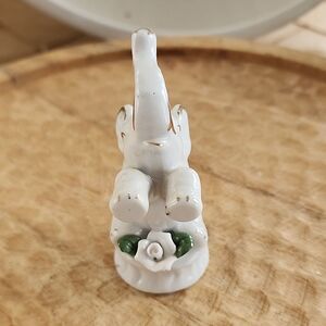 Sweet vintage porcelain elephant sitting on a stand with gold tone handpainted accents and a flower. Perfect for the elephant collector or vintage collector of tchotchkes