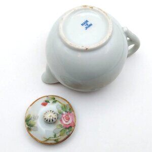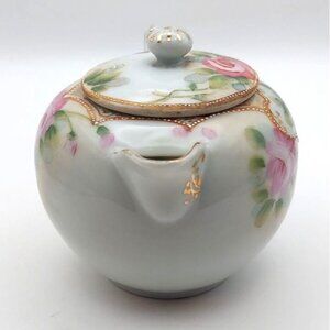 This exquisite vintage teapot exudes elegance with its handpainted floral design and delicate gold trim. Crafted in Japan, it is a testament to fine artistry and craftsmanship. The teapot's intricate rose motif and charming form make it a delightful addition to any collection, while offering a glimpse into a bygone era of graceful tea ceremonies.