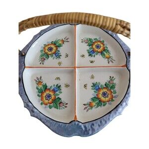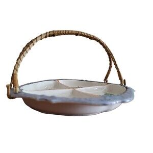 Vtg Handpainted Moriyama (Japan) Ceramic Four-way Divided Dish w/Rattan Handle.